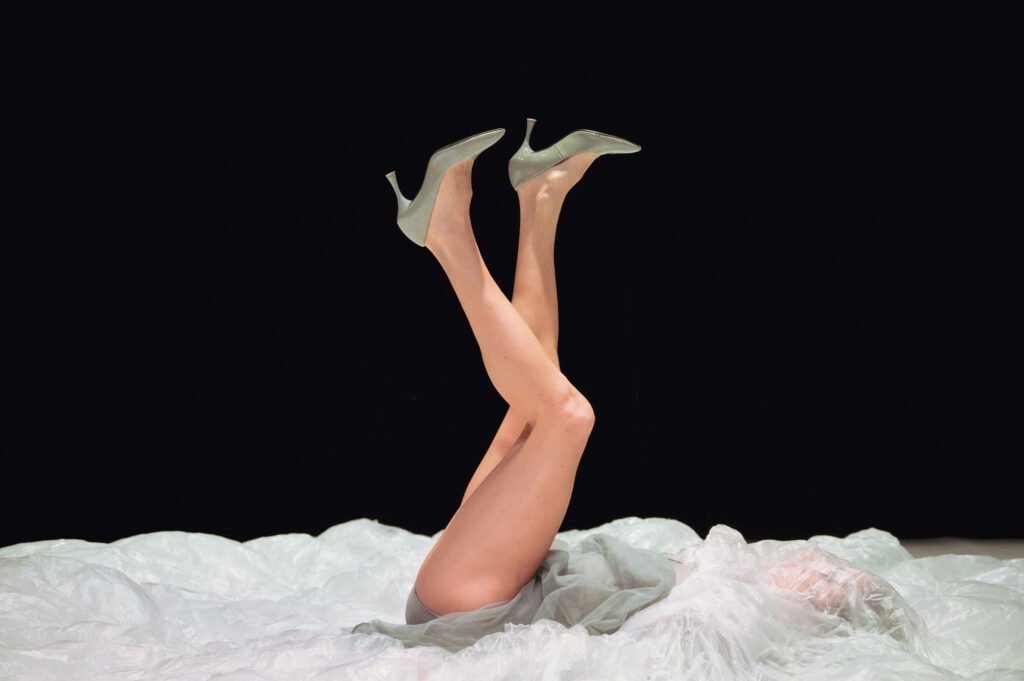 una bolsa plástica circular de tres metros de diámetro que se transforma en vestido, superficie líquida y contenedor fúnebre.