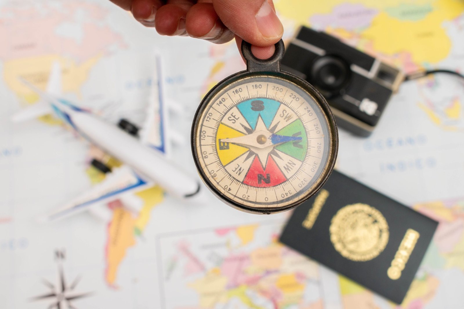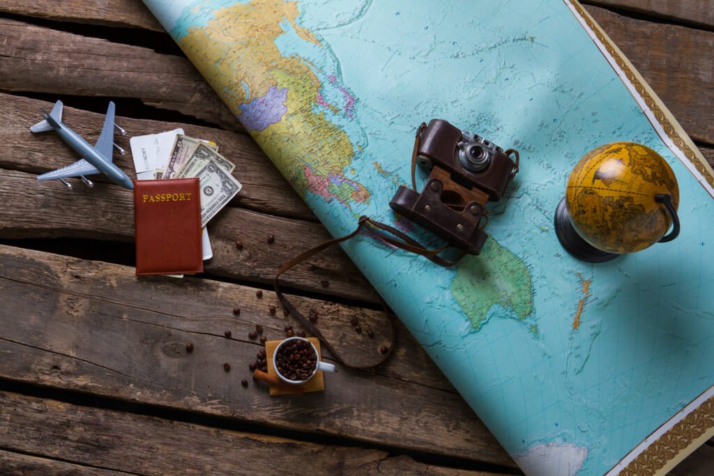 Passport and big map. Globe near vintage camera. Choose any place on map. You can travel freely.