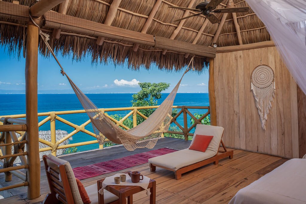 Las habitaciones y casitas de Xinalani están diseñadas para integrarse con el entorno, no para dominarlo. Materiales naturales, ventilación cruzada, terrazas abiertas y vistas directas al mar o la selva hacen que el hospedaje se sienta más como un santuario que como un hotel tradicional.